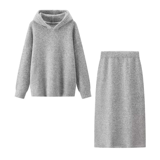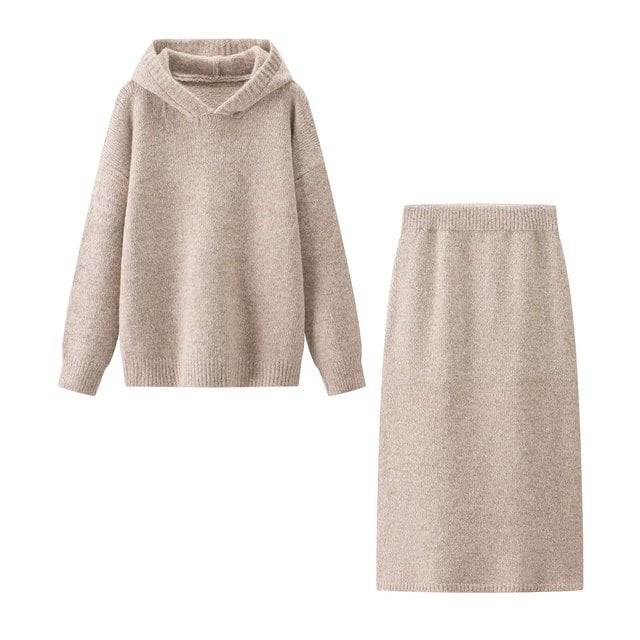 新作 フレンチデザイン リラックススタイル カジュアルフード付きニットセット スカート付き (2ピース) セットアップ
