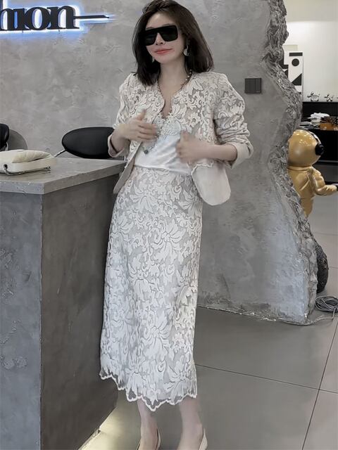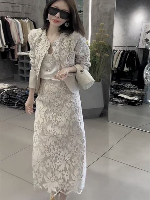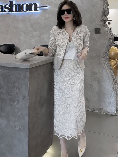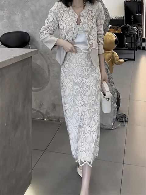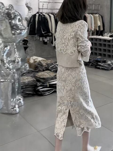 新作 シングルブレストのレース 長袖コート ハイウエストのバックスリットスカート
