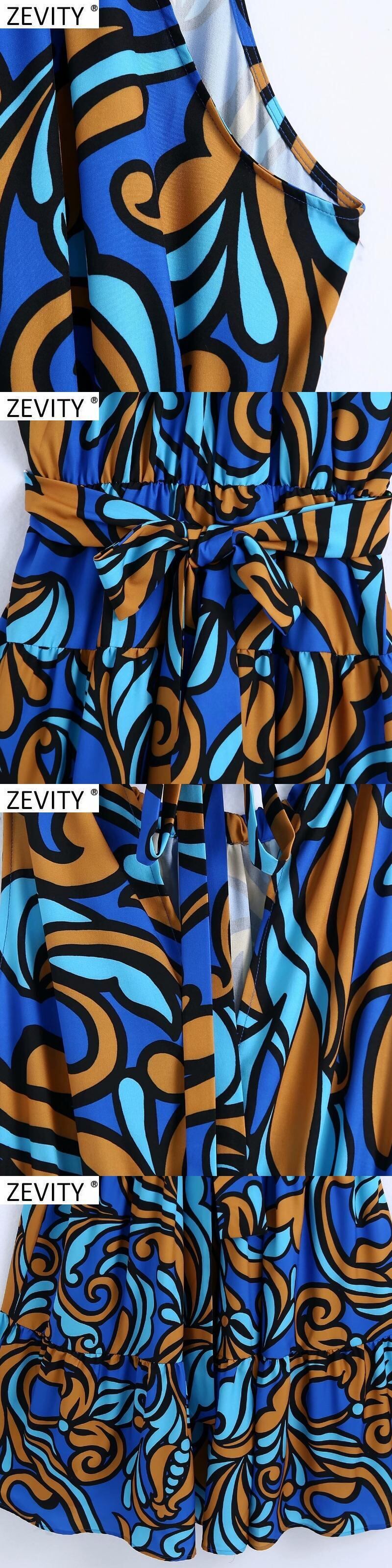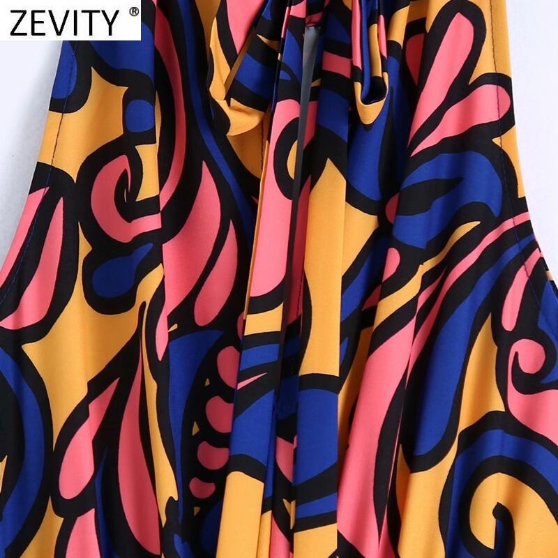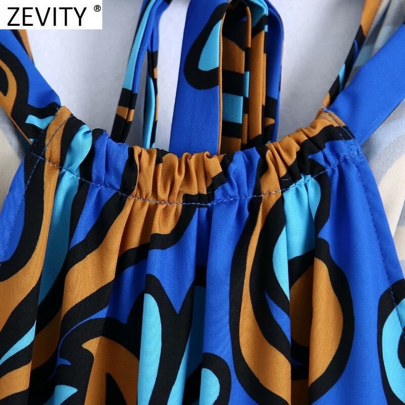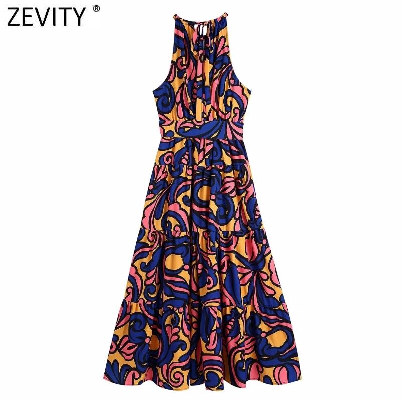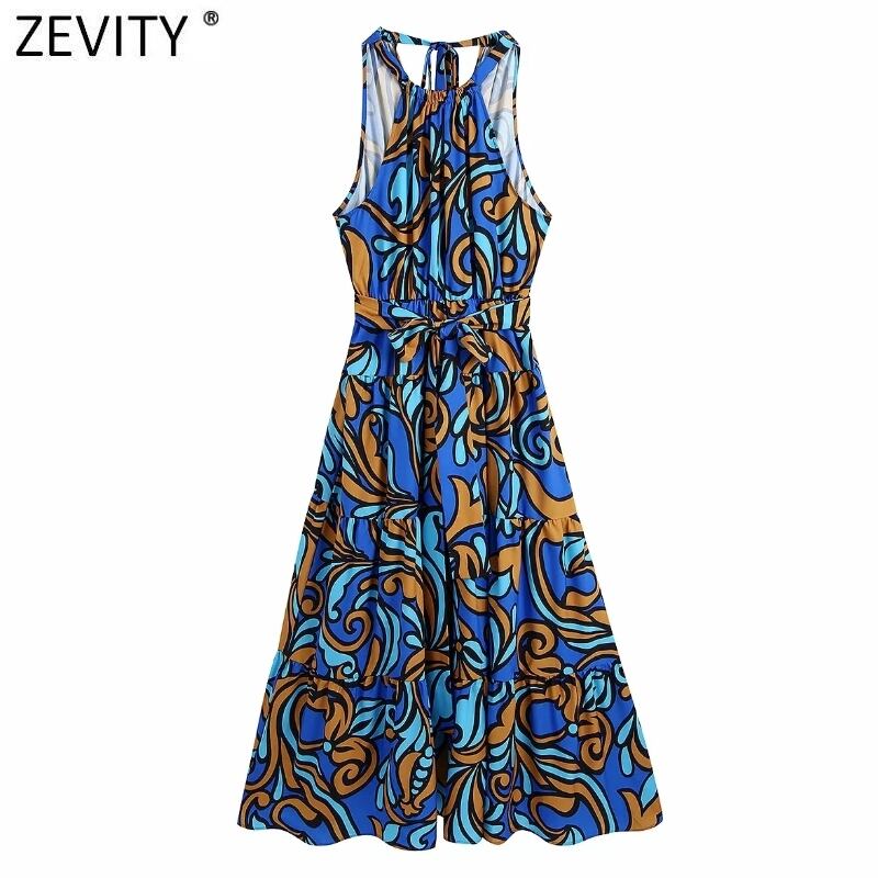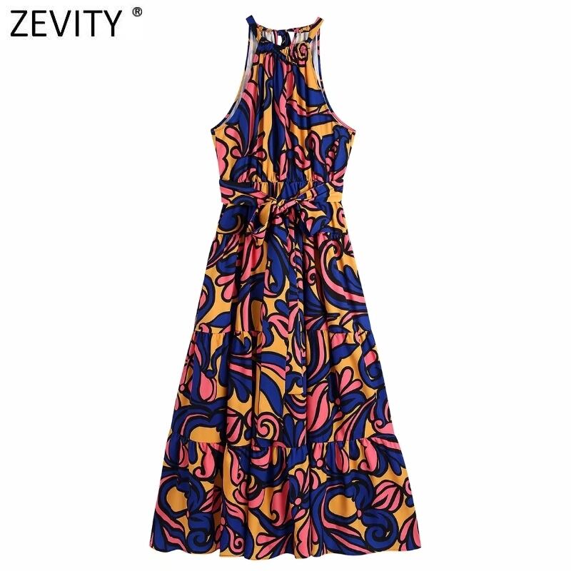 Zevity WomenVintageノースリーブコントラストカラーグラフィティプリントホルターミディドレスシックなボウサッシュスリム Amy50313552803