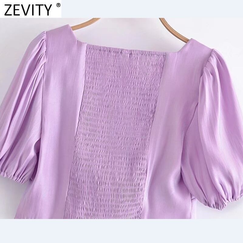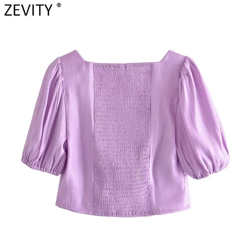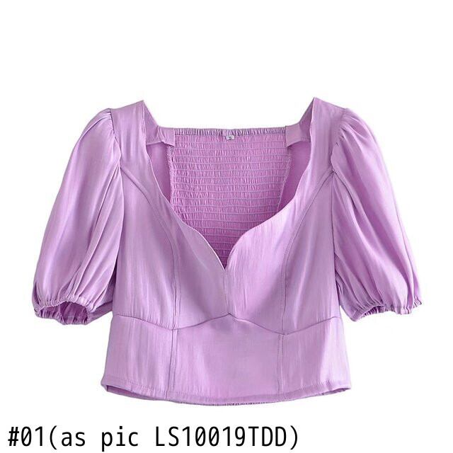 女性フレンチスタイル無地ショートブラウスレディシックパフスリーブバック伸縮性スリムシャツクロップトップLS10019 エラスティック ソリッドカラー