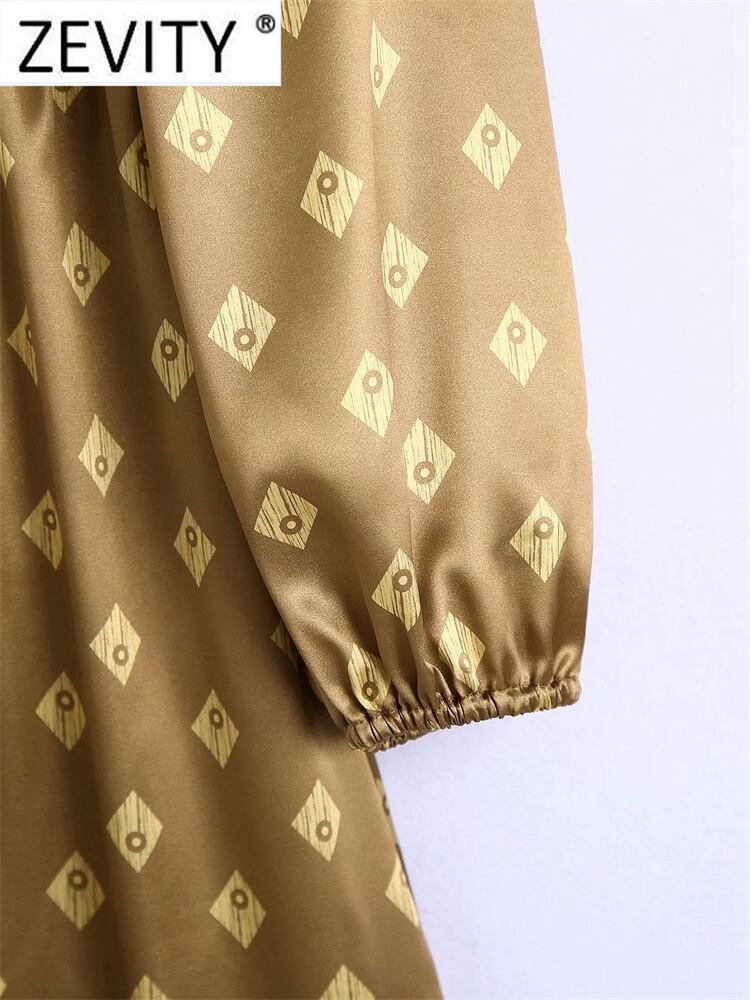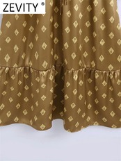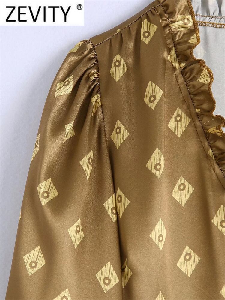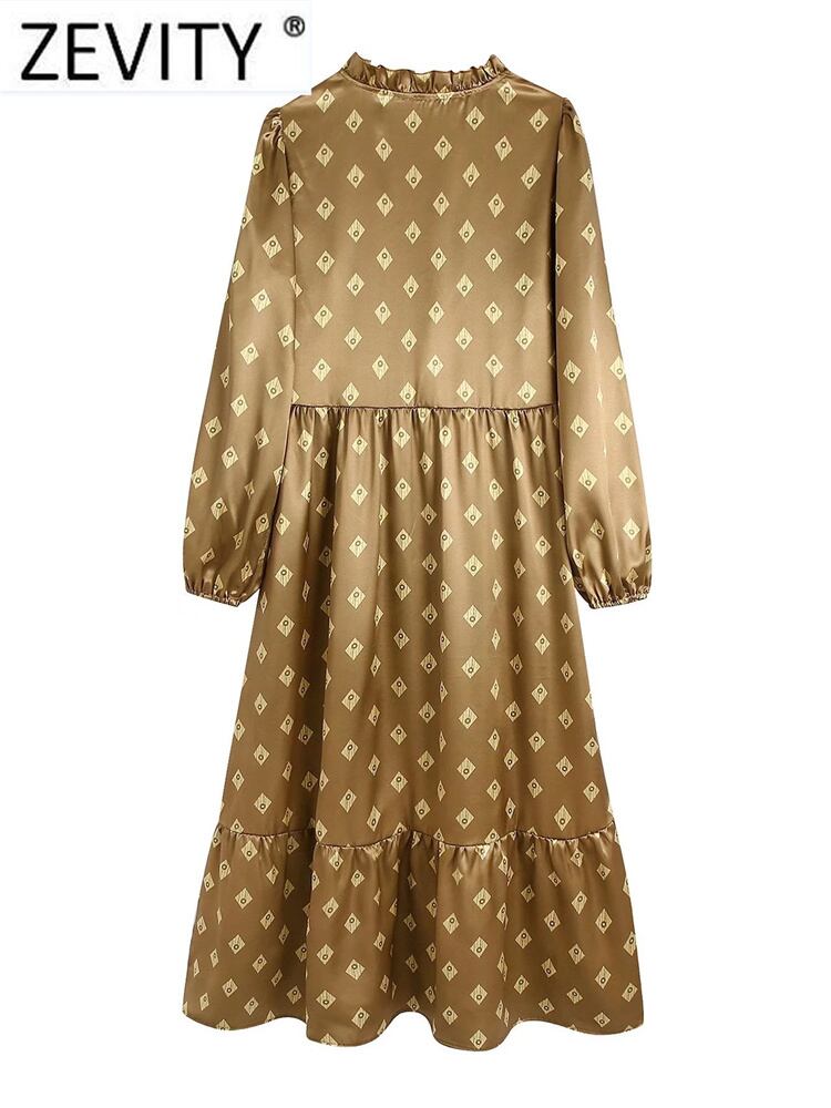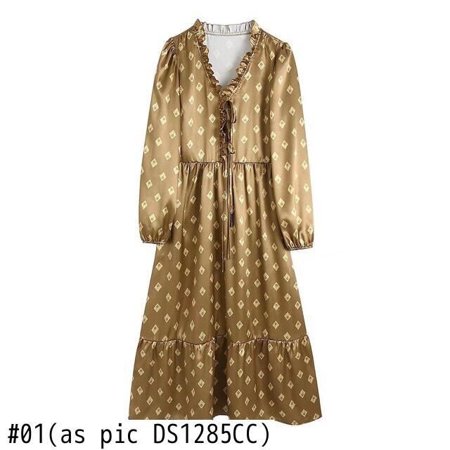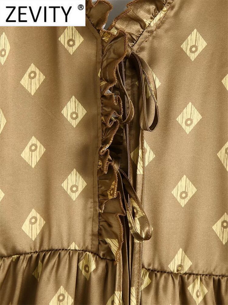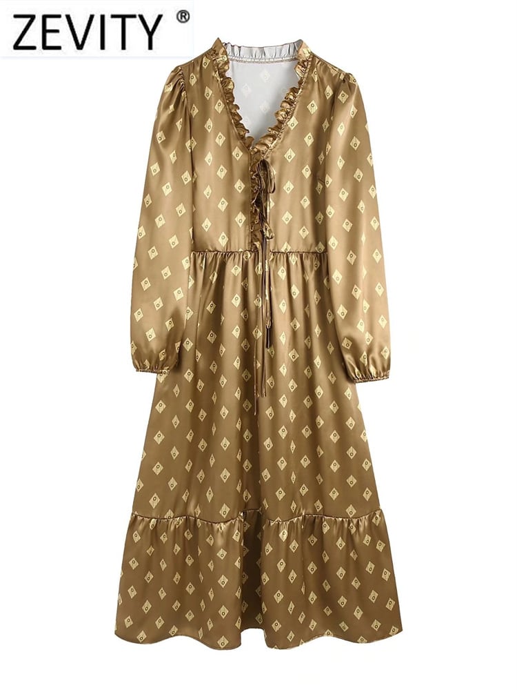 女性プリーツフリルレースアップVネック幾何学模様スリムミディドレスシックなソフトサテン ラッフル