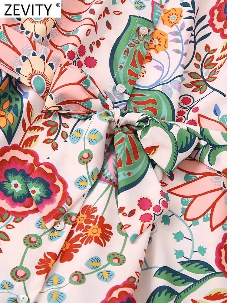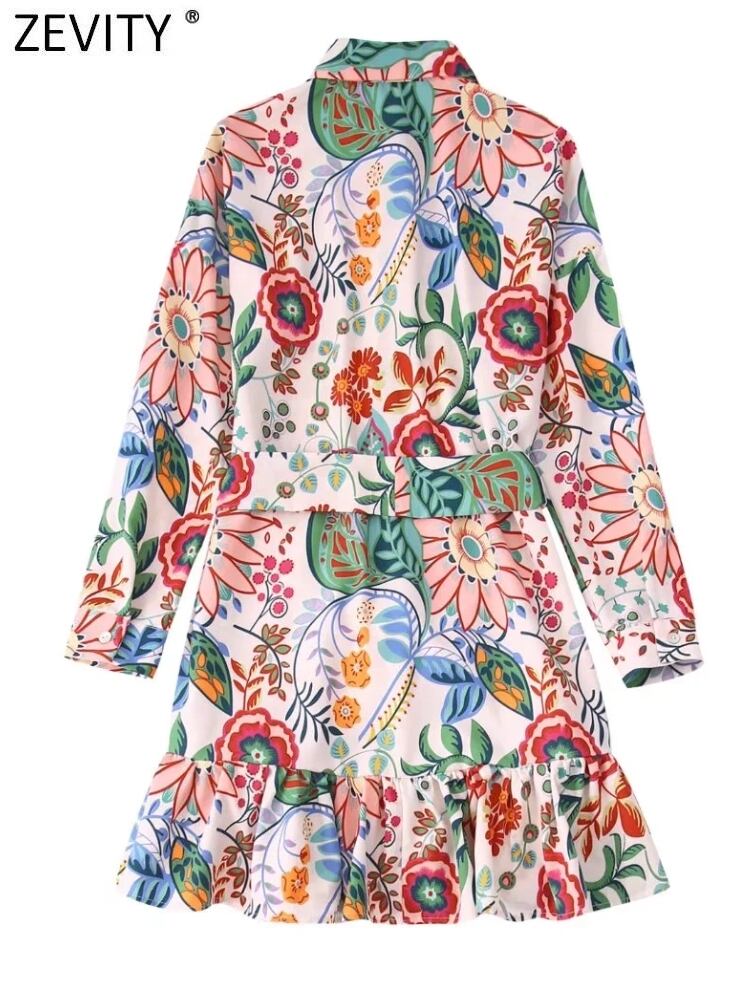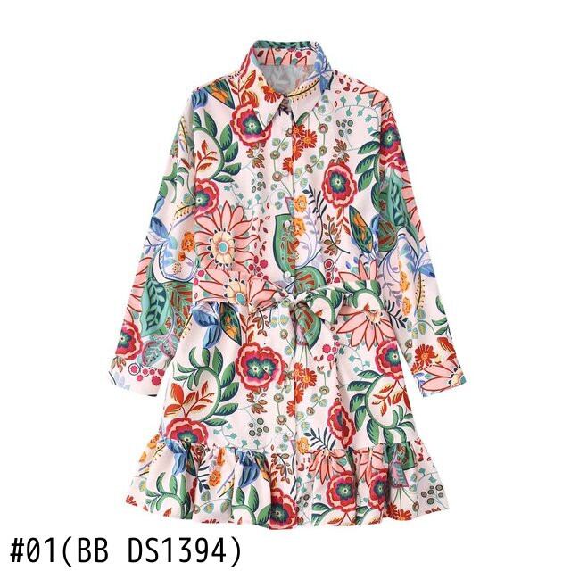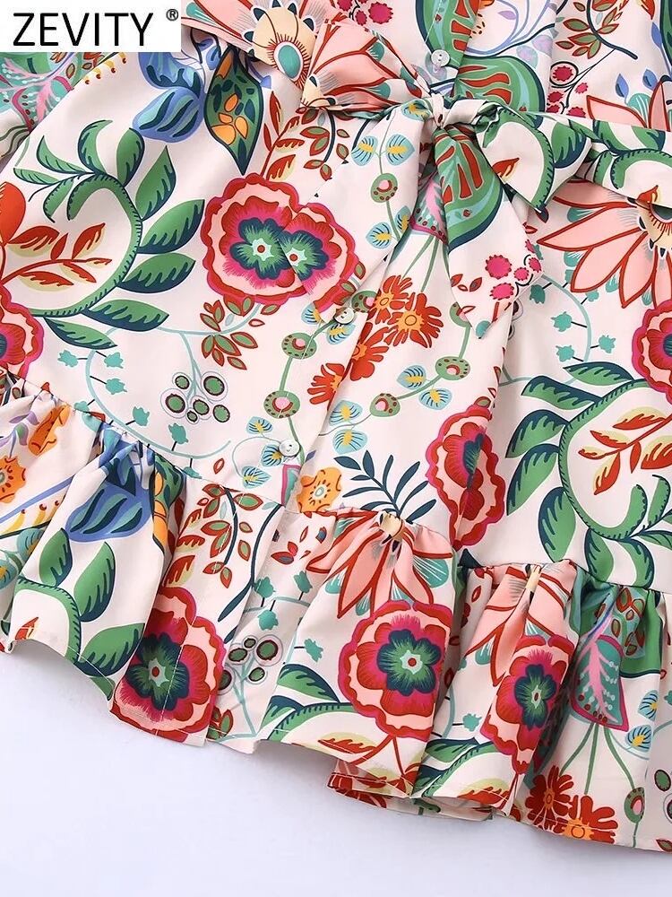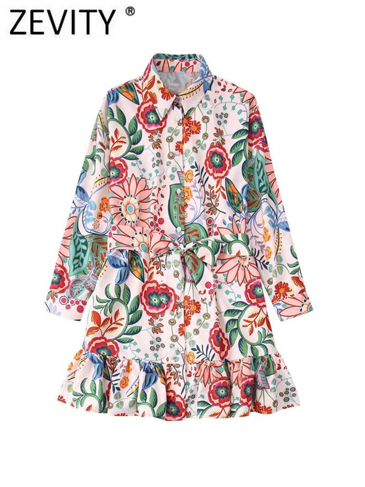 女性トロピカルフローラルリーフプリントブレストミニシャツドレスシックな弓サッシュプリーツフリル A ライン Vestidos DS1394 リボン ラッフル 花柄 Aライン